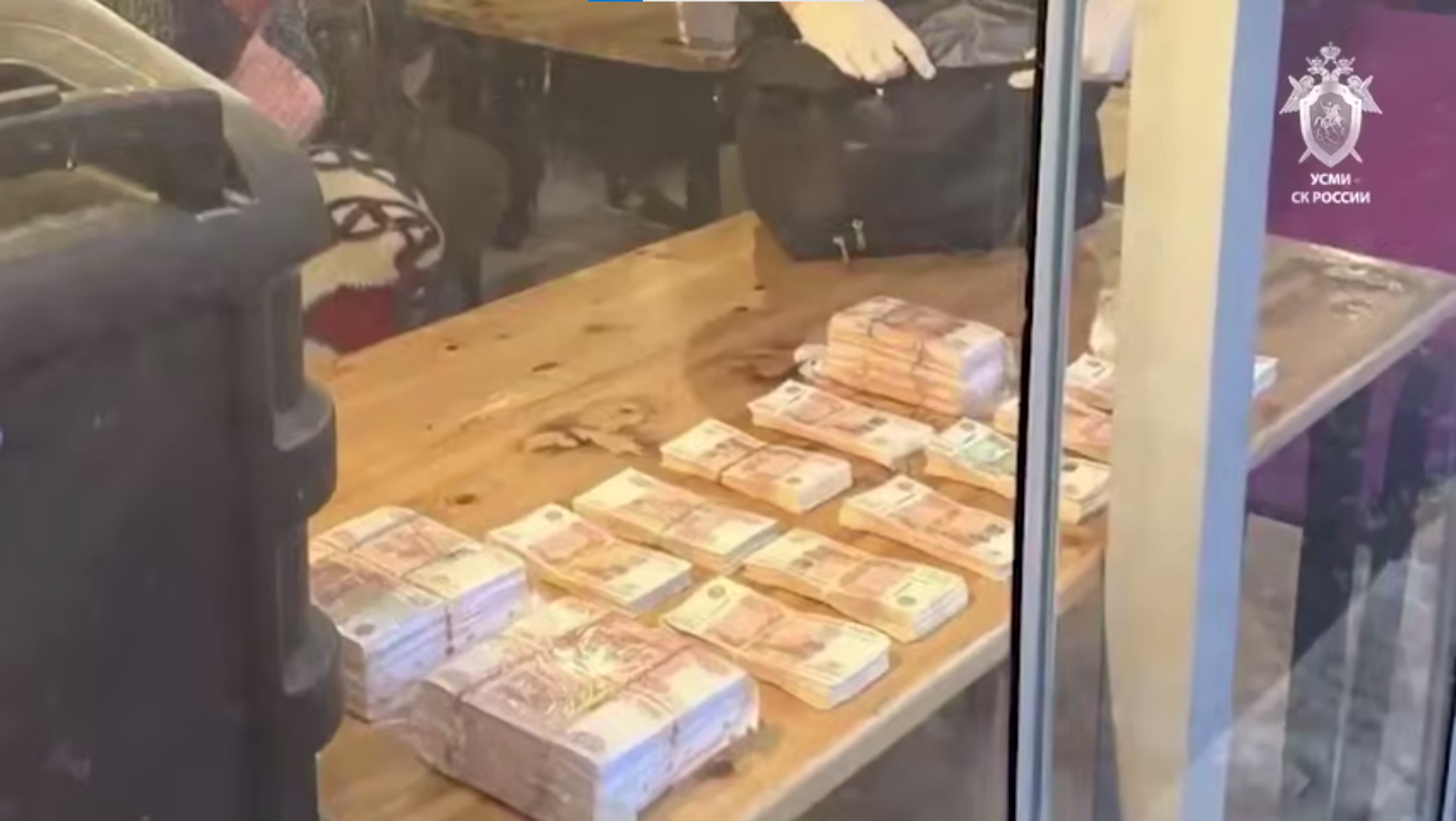 На опубликованных кадрах оперативной съемки видно, как у задержанного изымают крупную сумму наличных, разложенных на столе.