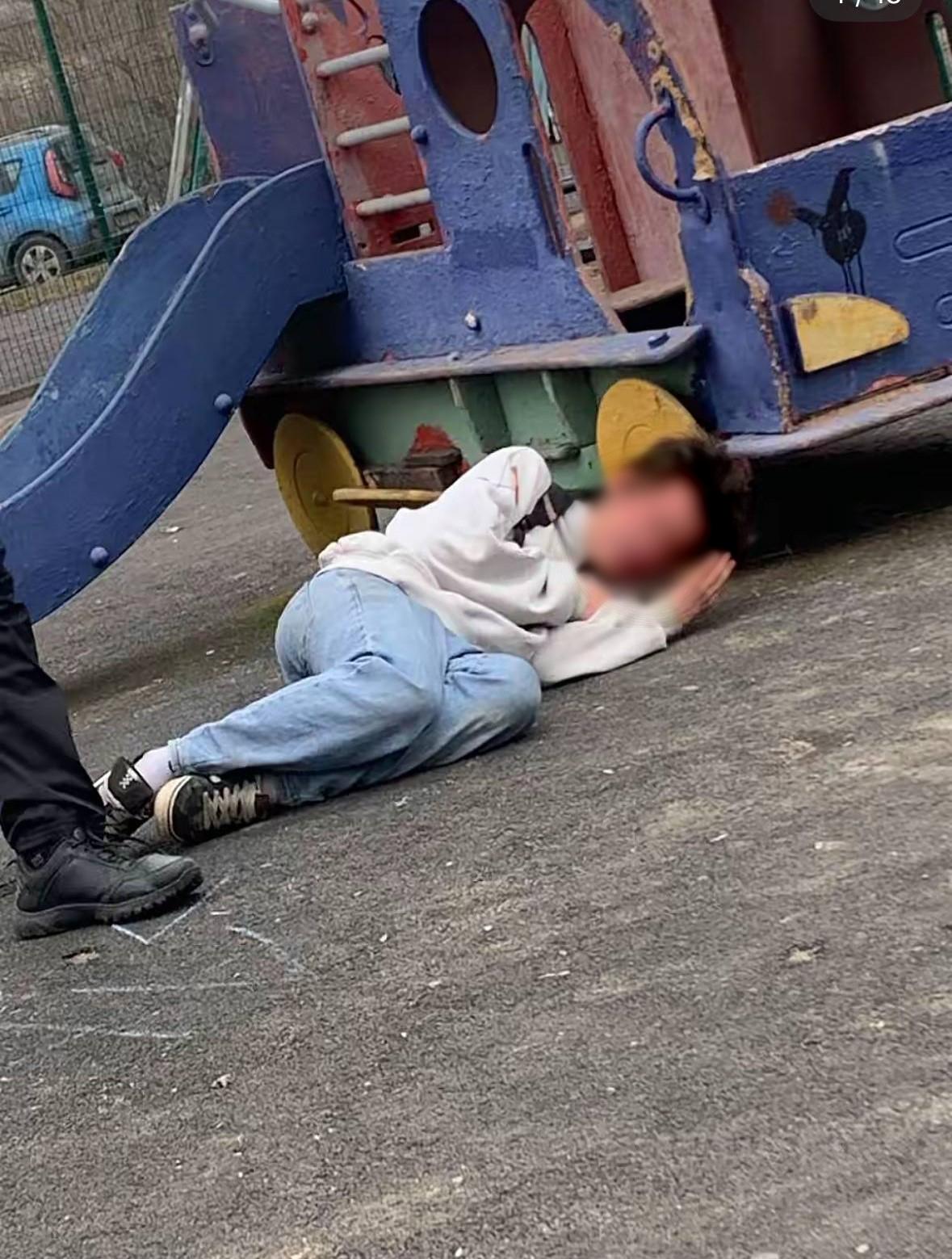 Кадр, где пострадавший парень лежит на детской площадке после избиения