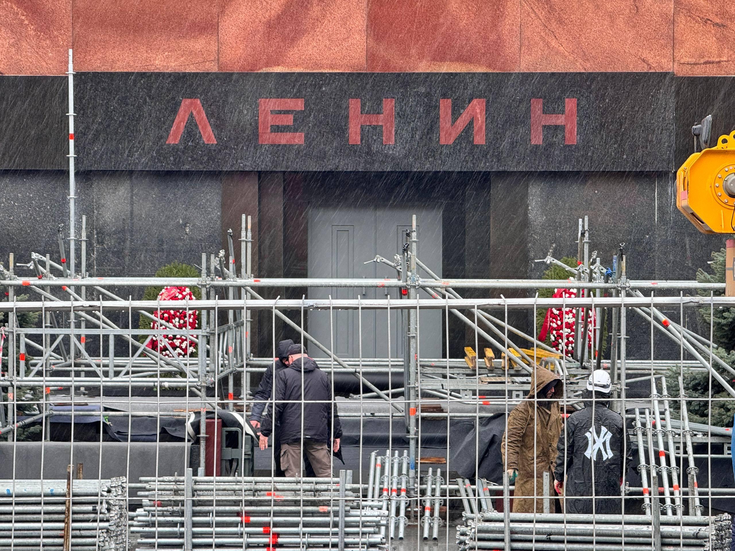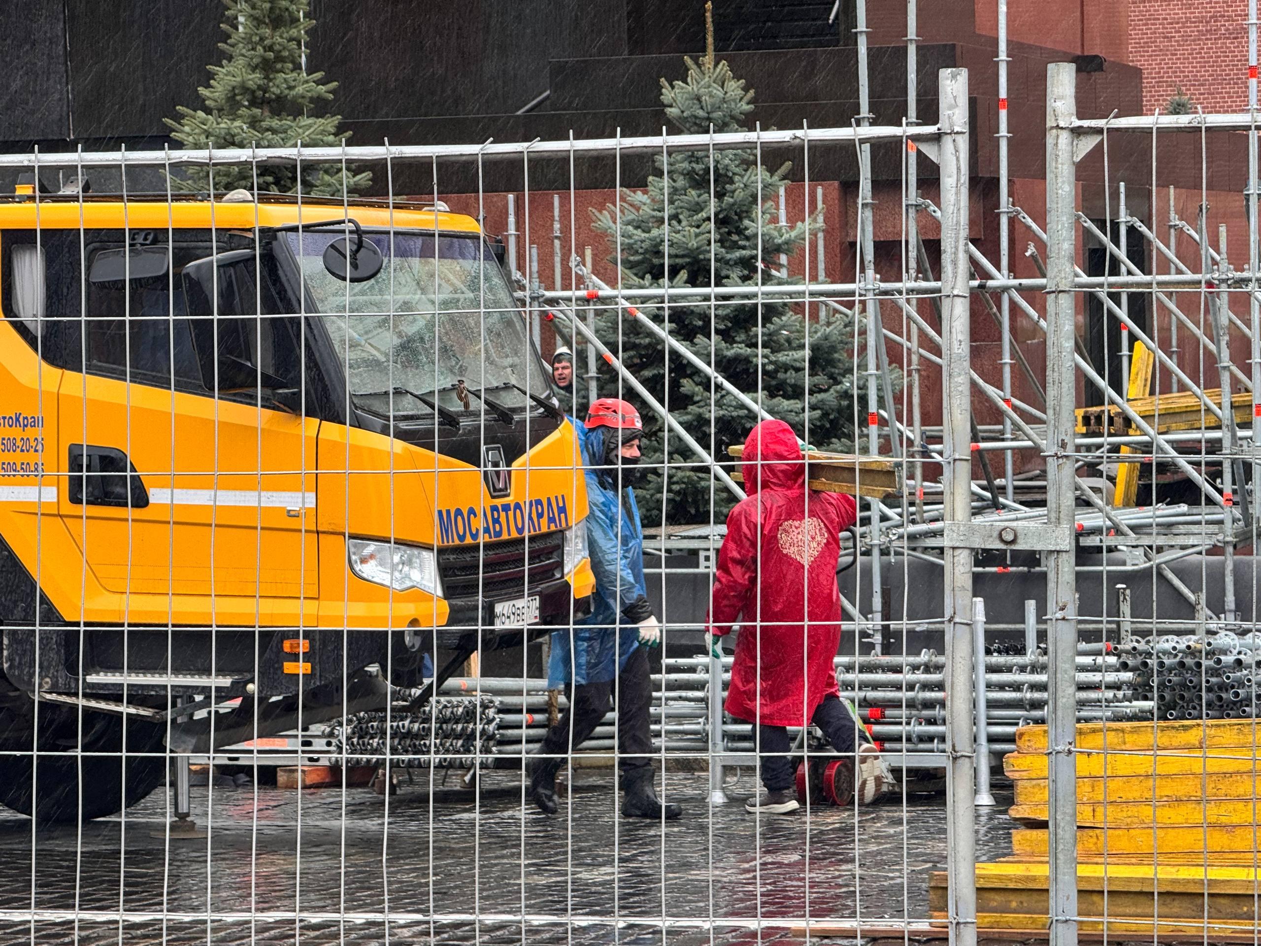 Сейчас возле Мавзолея установлены строительные леса, подход полностью огорожен. На месте работает строительная техника и десятки рабочих.