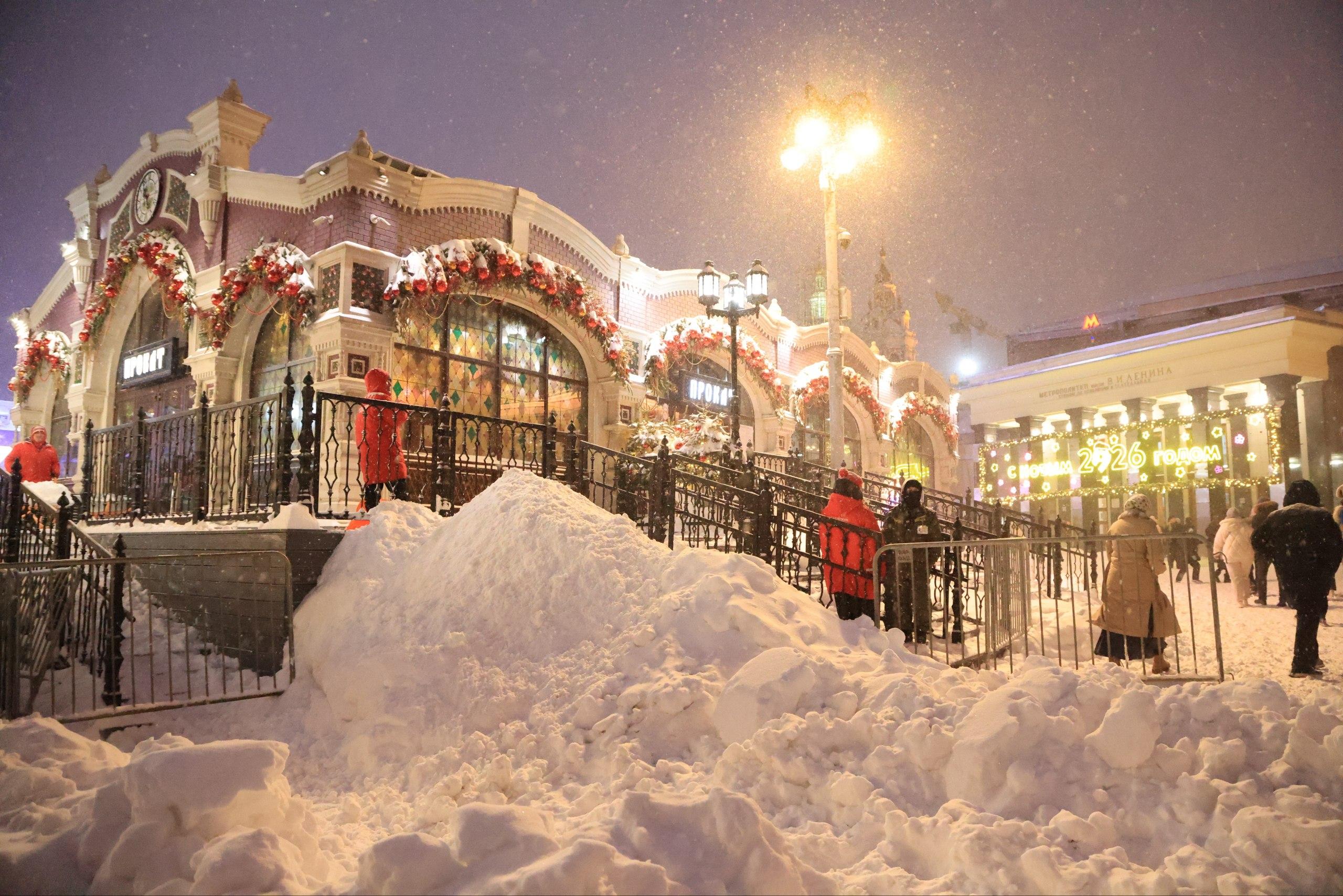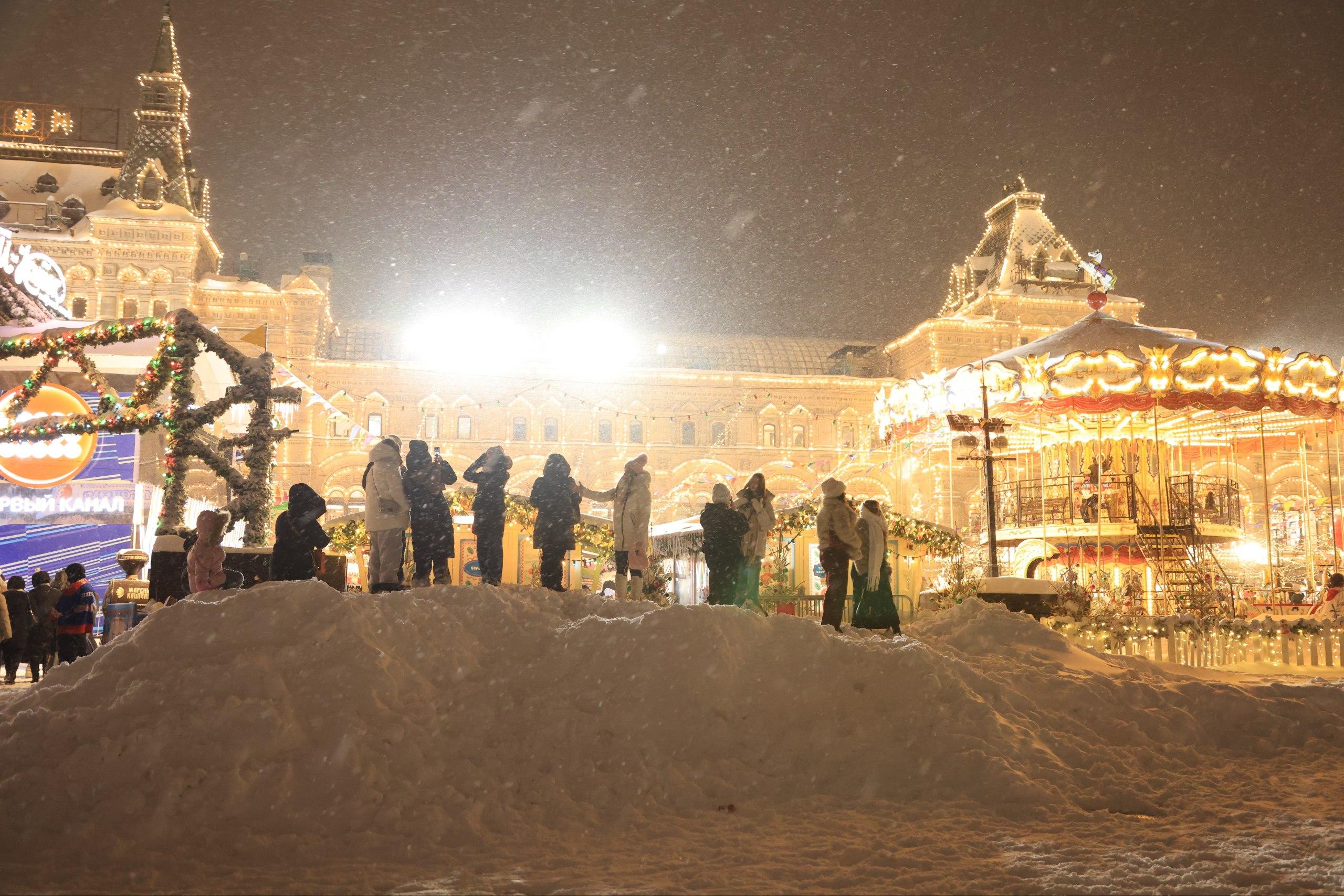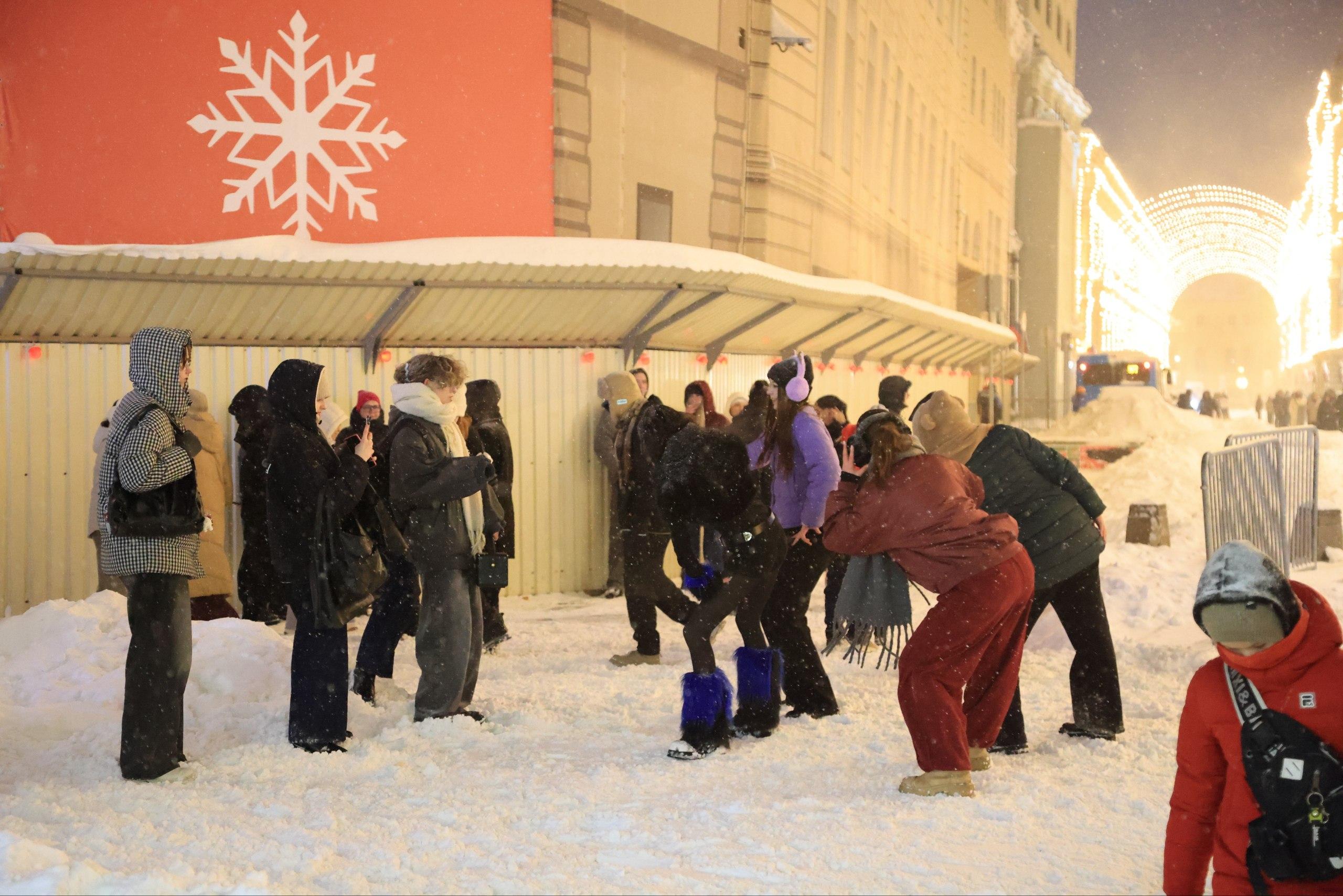 Красная площадь во время снежного циклона «Френсис»: высокие сугробы, толпы и заграждения.