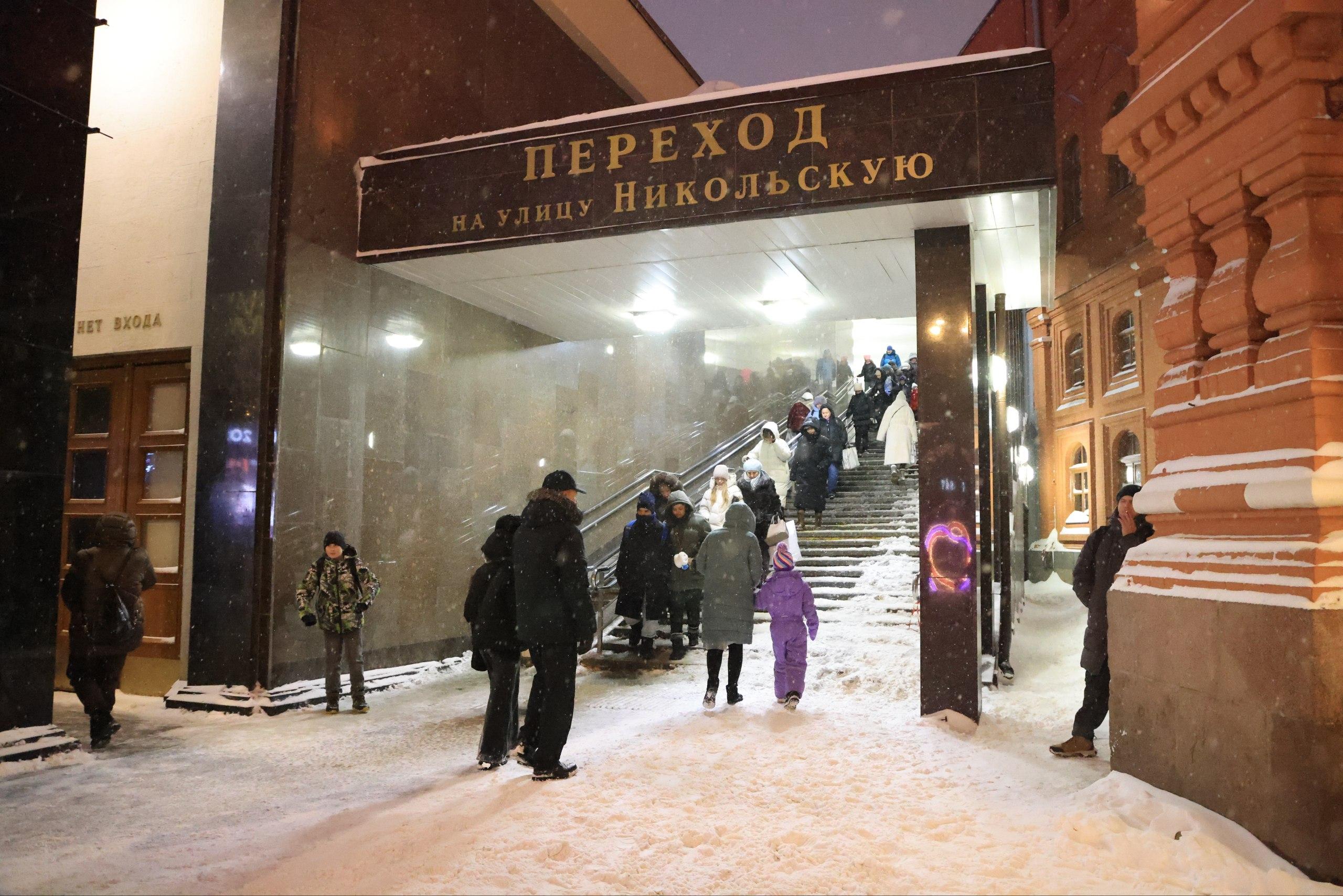 Основные проблемы начинаются у выхода из метро. Ступени в переходе между Никольской и Манежной площадью занесены снегом. Люди медленно преодолевают их, цепляясь за каждую ступеньку, чтобы не упасть.