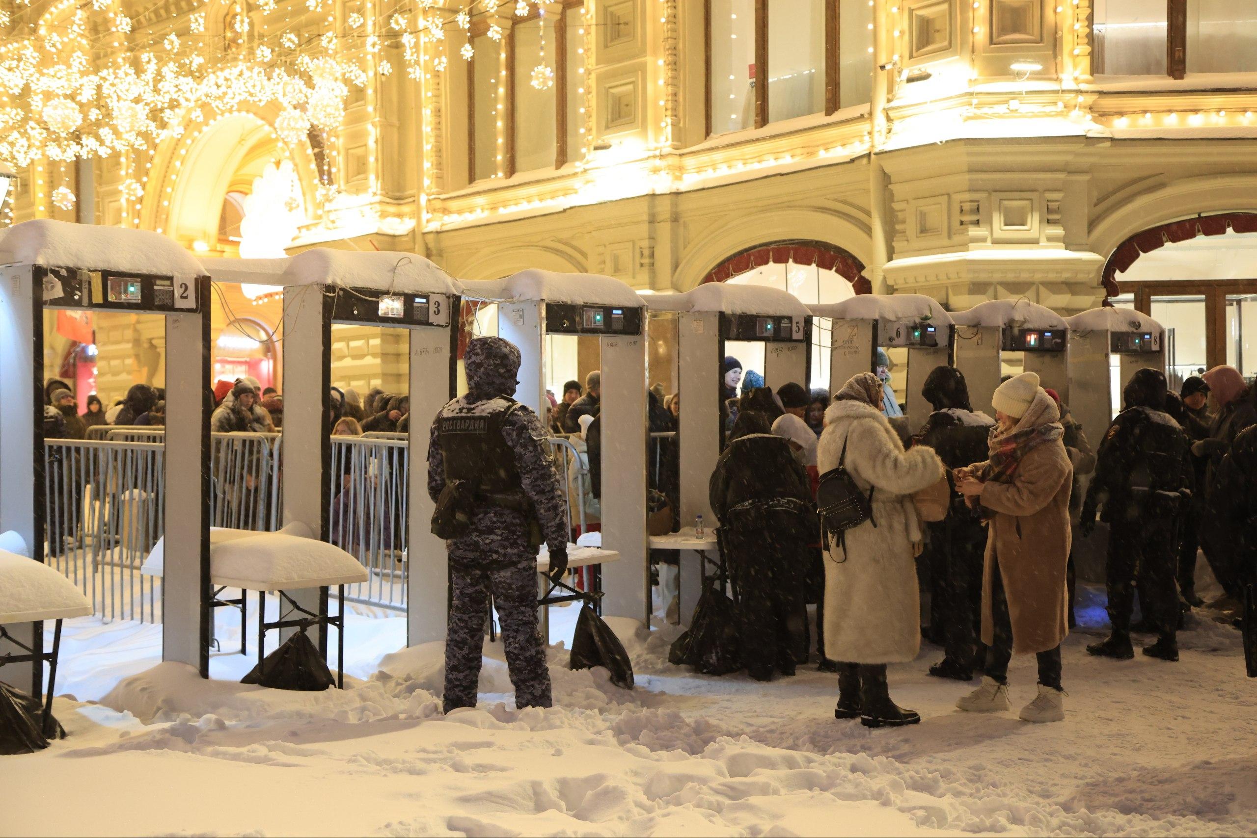 Вход со стороны Никольской улицы, как обычно, огорожен. Посетители вынуждены проходить через узкие проходы с металлодетекторами.