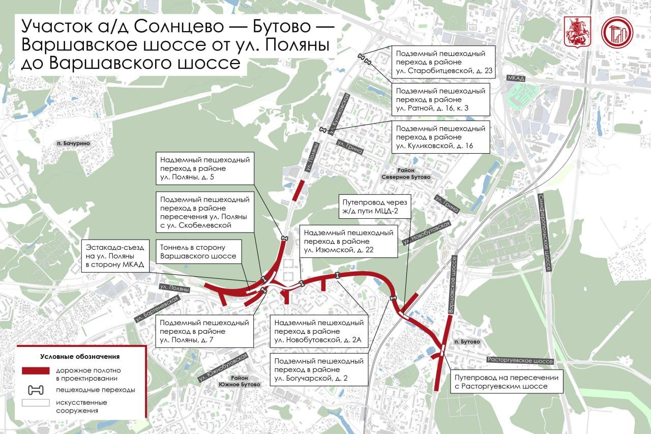 Строительство магистрали от Минского до Варшавского шоссе ведётся поэтапно с 2018 года. Общая протяжённость трассы «Солнцево — Бутово — Варшавское шоссе» по прямому маршруту, включая Внуковское шоссе, достигнет 26,6 километра. Финальный, пятый этап предусматривает запуск отрезка от улицы Поляны до Варшавского шоссе.