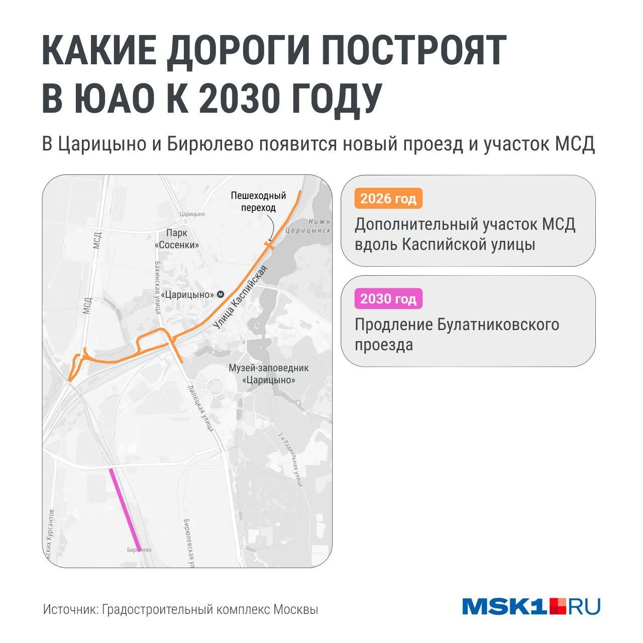 Новый отрезок Московского скоростного диаметра проложат по Каспийской улице в районе Царицыно, продлив её от Бакинской улицы до основного хода диаметра. Ожидается, что это произойдёт в 2026 году.
