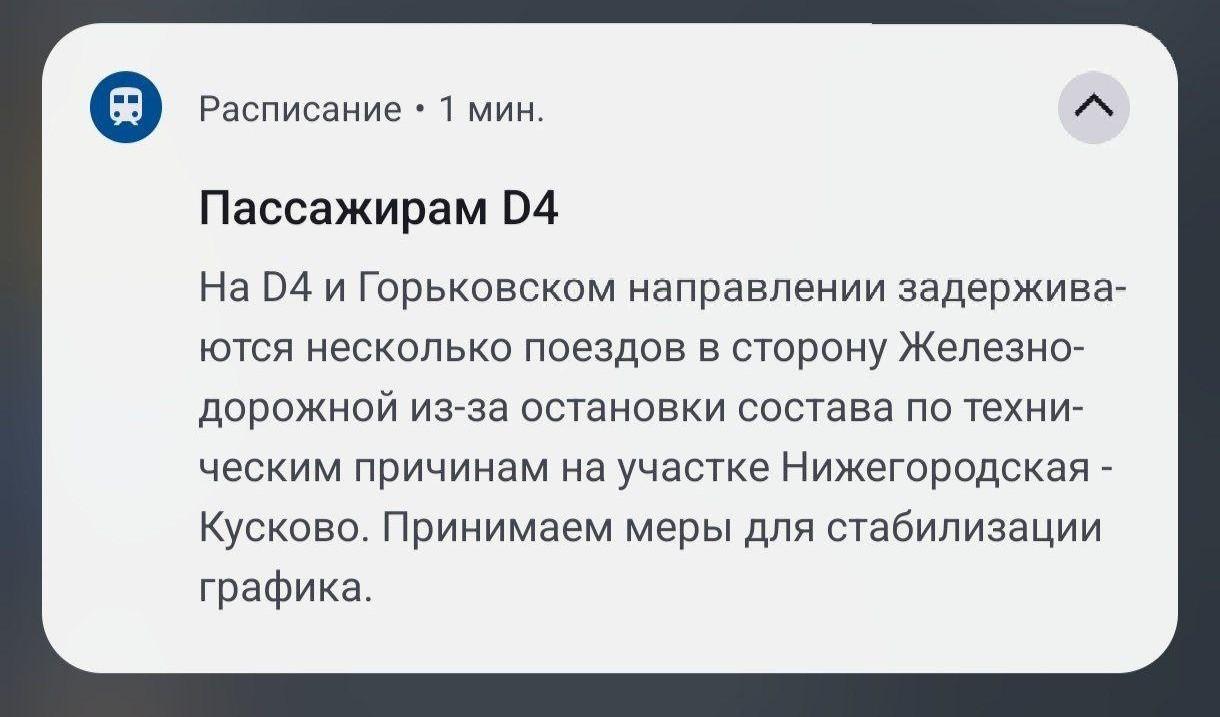 На линии Московских центральных диаметров №4 произошел масштабный сбой, приведший к остановке движения электричек. Движение было нарушено на участке от Нижегородской до Реутова по второму пути в направлении Железнодорожного.