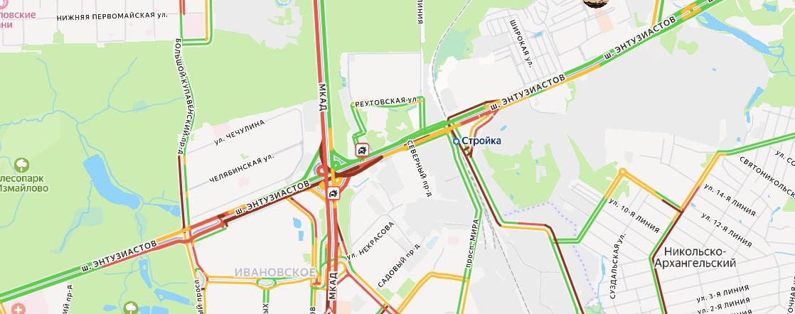 Затор протяжённостью почти семь километров образовался на шоссе Энтузиастов в направлении Балашихи. Серьёзные затруднения также наблюдаются на МКАД в сторону Новокосино.
