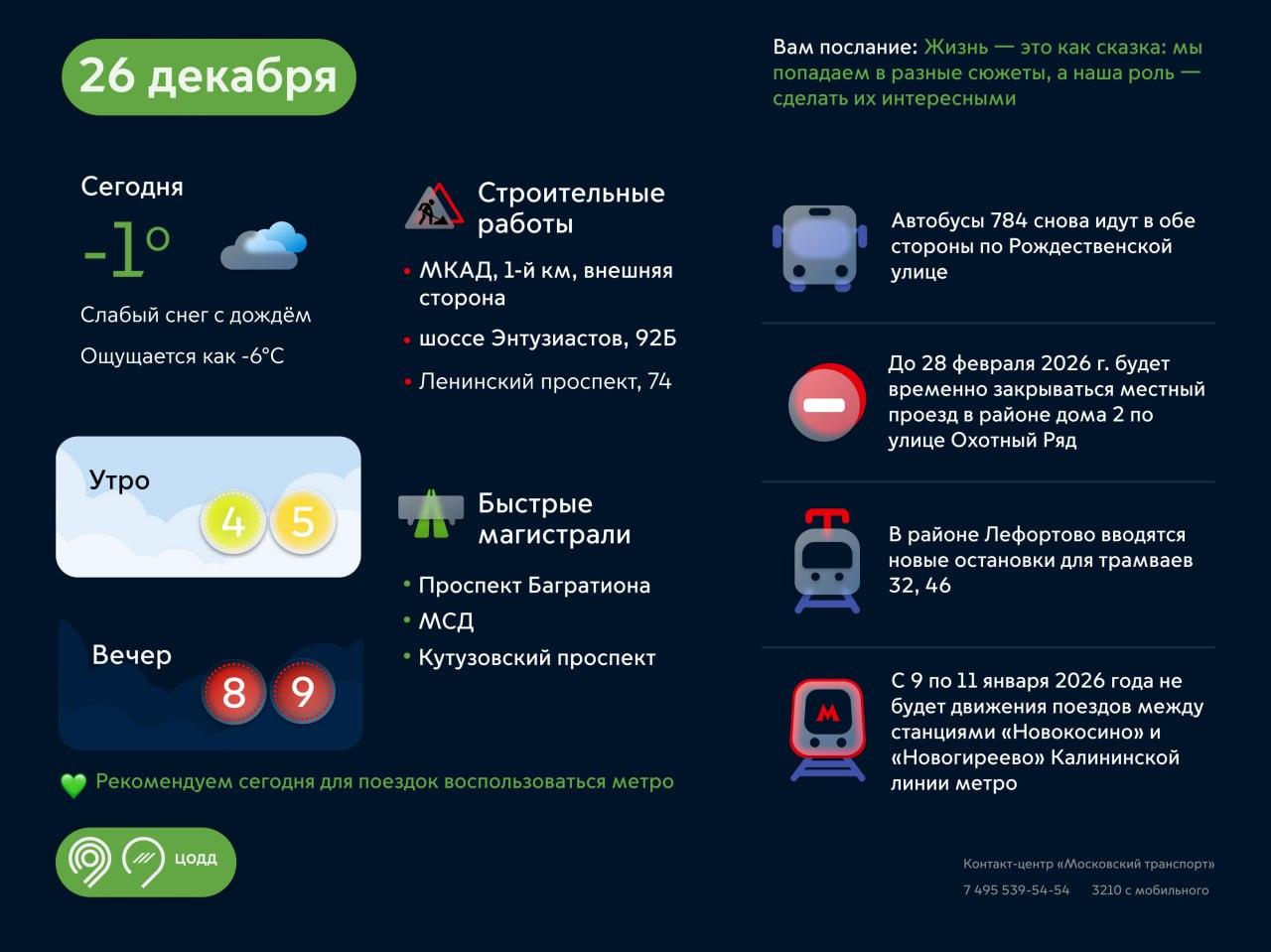 На дорожную обстановку сегодня могут повлиять не только погодные условия, но и высокая активность в конце недели, короткий рабочий день, ремонтные работы и мелкие ДТП. ЦОДД призывает водителей соблюдать скоростной режим и не отвлекаться на телефон во время движения.