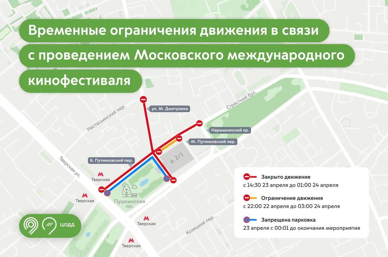 Дополнительно с 22:00 22 апреля до 03:00 24 апреля будет частично сужена проезжая часть. На Большом Путинковском переулке от Малого Путинковского переулка до Малой Дмитровки закроют крайнюю левую полосу.