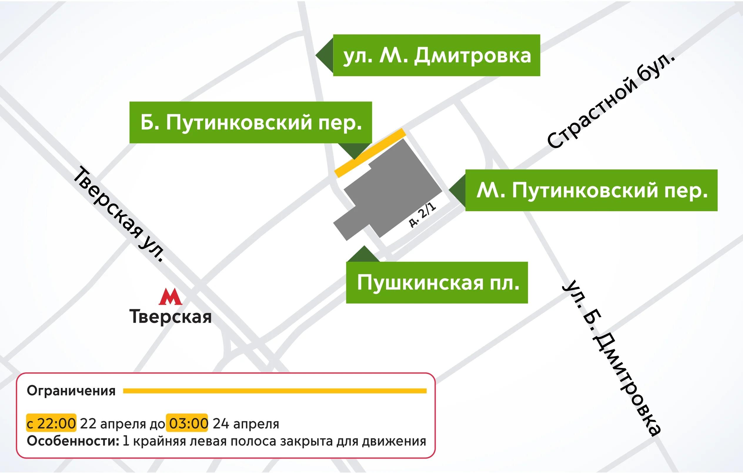 22 апреля с 22:00 до 03:00 23 апреля закрыта крайняя левая полоса Большого Путинковского переулка. Парковка на этом переулке и Пушкинской площади запрещена до 23 апреля.